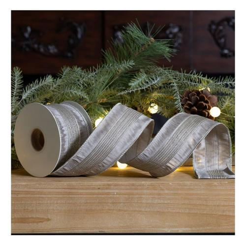 Embellish your home decor items, gift wrap, craft projects, and more with this beautiful Wired Holiday Ribbon. Measuring 2.5"x10 yards in length, the roll of ribbon features a glittered striped design. The classic grey tones paired with quality polyester and iron wire composition is the perfect combintion to create a stunning holiday display. Use this ribbon to make hand-tied bows to adorn onto your Christmas presents or holiday wreaths, or embellish your Christmas tree with a trailing ribbon garland.