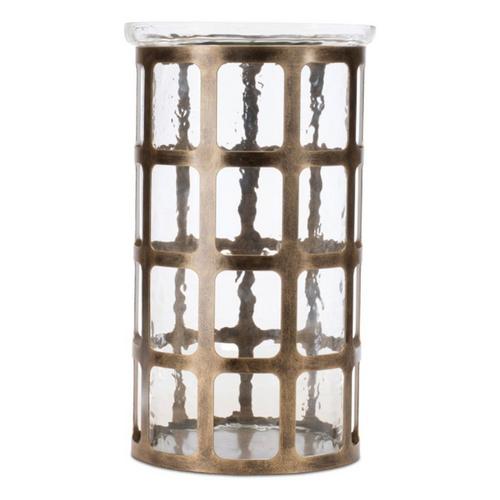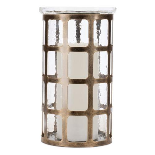 Add a touch of chic style to your home with this Wavy Glass Candle Holder. Measuring 12.5" tall, this piece is a great fit for your contemporary or modern style of home decor. The abstract wavy glass hurricane paired with the distressed gold metal frame is the perfect combination to create a stunning display. The quality glass and iron metal composition is sure to endure for seasons to come. Illuminate the display by adding a real wax or LED candle to the holder. Candles sold separately, this piece best fits a 4" or 5" pillar candle.