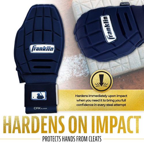 Protect your hands on the while running on the basepaths with Franklin Sports' MLB CFX Baseball + Softball Sliding Mitt! These sliding mitts are the perfect piece of baseball equipment to help baserunners steal bases and slide headfirst while protecting their hands. These reversible sliding mitts can be worn like gloves on both the left and the right hand for protection. The soft-shell design hardens on impact to help protect runners from jamming their hands and fingers on the dirt or bases when sliding. These sliding mitts are also constructed with a secure, reinforced wrist strap to help stabilize the wrist and prevent sprains. Plus, the soft, responsive feel of these gloves helps runners maintain use of their fingers to help grab the bag on steals without sliding right by. Baseball and softball players' greatest tools are their hands, so make sure they're being protected correctly. Grab yourself one of Franklin's CFX PRT Sliding Mitts and hit the basepaths today!