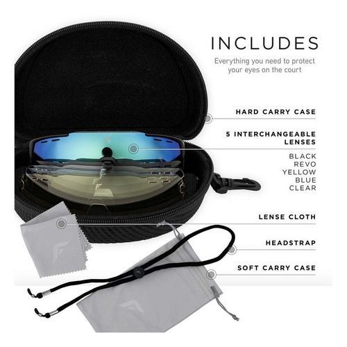 The Franklin Sports Eyewear Kit has everything you need to protect your eyes on the court. With (5) interchangeable lenses, each player is able to choose their proper lens color for specific game play. Store both the frame and all (5) lenses in the hard eyewear case for further product protection. Use the soft case to bring one lens with you on the go.
