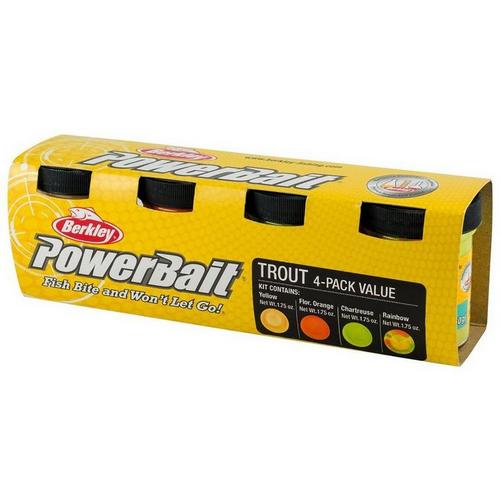Berkley® PowerBait® Trout bait is moldable and easy to use. The floating formula enchances dispersion of PowerBait scent and flavor. This 4-pack includes your favorite and popular colors: Chartreuse, Rainbow, Fluorescent Orange and Fluorescent Yellow.