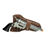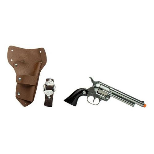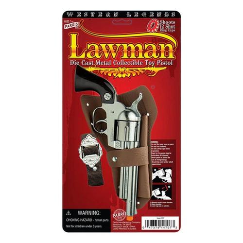 Includes vinyl holster, belt, and die cast metal toy pistol. Stay on the right side of the law with the Lawman Holster Set. Lawman Pistol fires our signature 12 shot action ring caps. Designed after the original pistols of the Wild West era. Constructed with solid die-cast metal that looks like real antique metal and quality plastic that looks just like real wood. Makes great Theatrical Props.