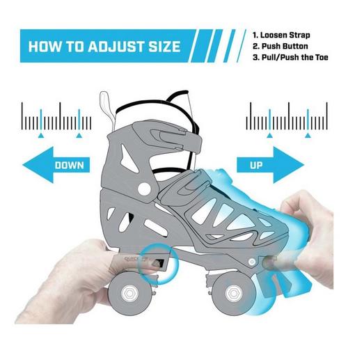 Perfect for growing kids who love to skate, the Trac Star offers performance and comfort with adjustable sizing to accommodate growing feet. High quality components and lightweight technology make it easy and fun to roller skate indoors or outdoors. Hinged shell and padded, washable liner give support and comfort for any skill level. Easy fit buckles and no laces to tie make it easy for children to put on themselves. The chassis is lightweight and durable with real trucks for controlled turning. In fact, these quad skates for kids are built for maximum agility and support. You'll be amazed at how quickly your child will be zooming along sidewalks or around the skating rink. 54mm Urethane wheels have just the right grip and bounce for both indoors and outdoors and are loaded with G-Force 608ZB carbon bearings. These adjustable roller skates for kids fit true to a child's shoe size.
