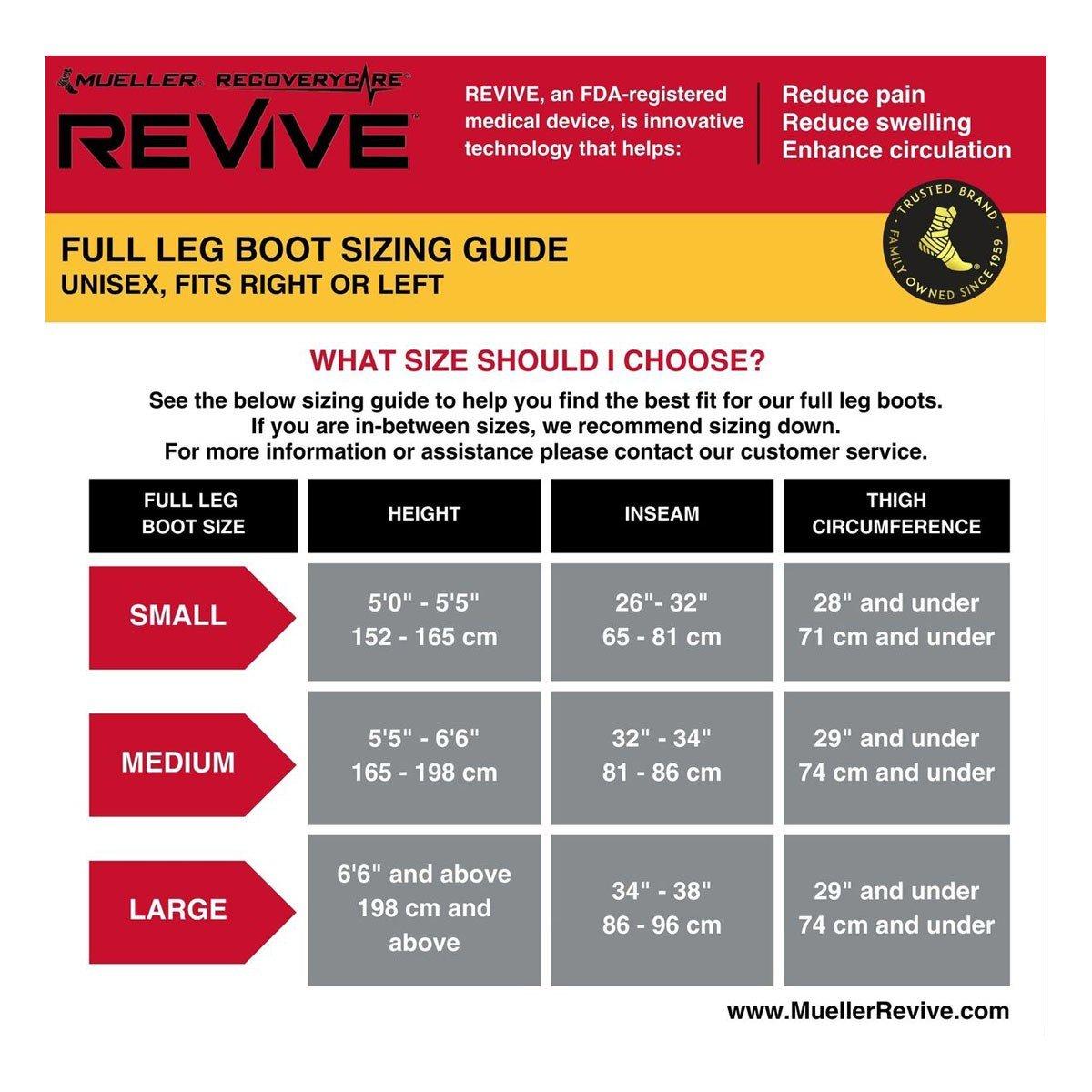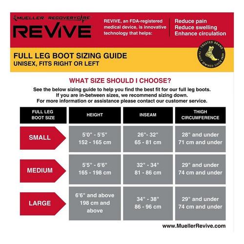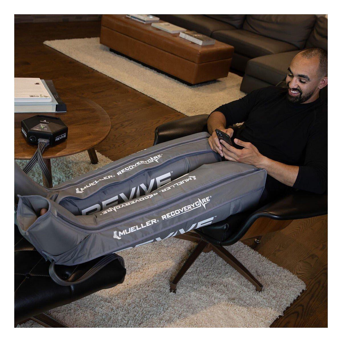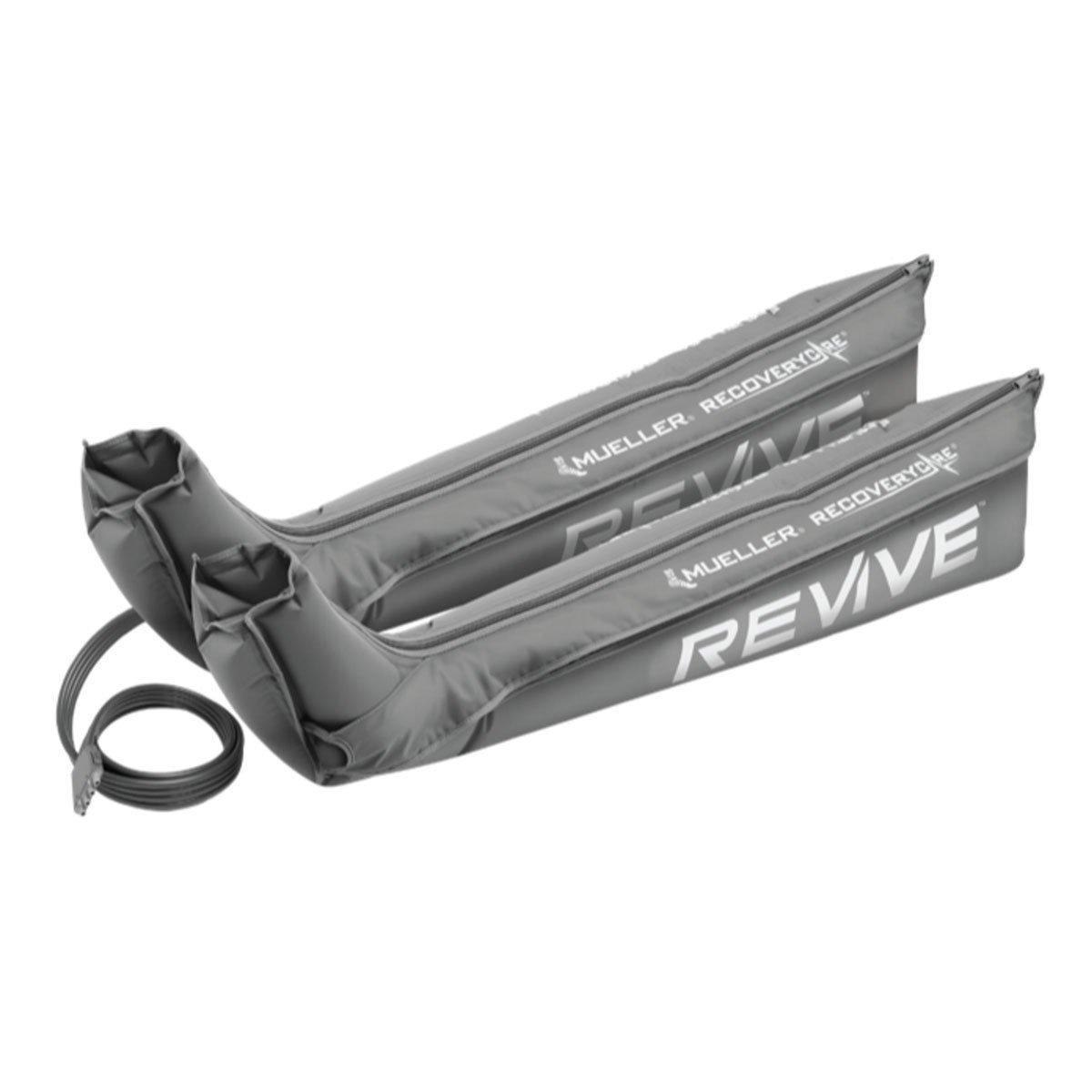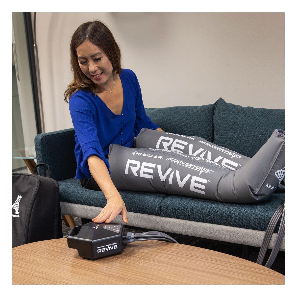 Accelerate recovery, reduce pain, and improve performance with new Mueller® RecoveryCare® REVIVE™ Compression Technology. By stimulating the body’s natural circulation with precise levels of pressure, REVIVE™'s innovative compression sleeves, M2 Console, and overlapping chambers promote faster recovery before, during, and after workouts, activity, or just standing on your feet. This adjustable system optimizes your recovery with a personalized range of therapeutic pressure. The durable, portable, and lightweight unit is hassle-free, simple to clean, and powered by 8-hour battery life. Gear packs consist of console and leg sleeves only. Backed by a 90-day risk-free trial.