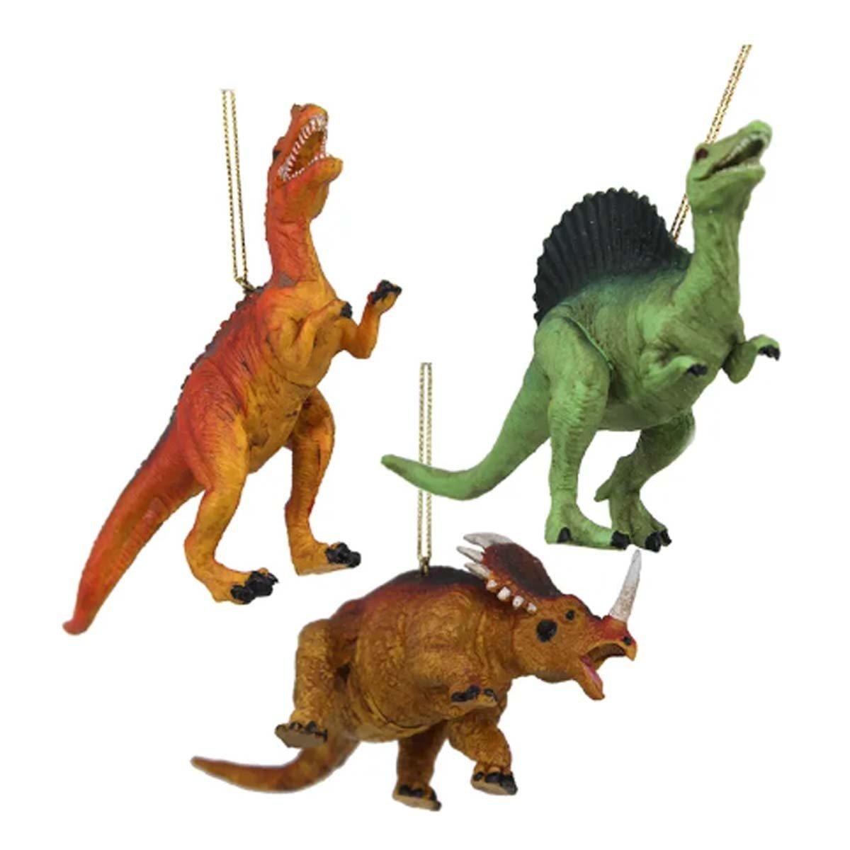 These Kurt Adler dinosaur ornaments are a fun and wild addition to any holiday décor or Christmas tree. This assortment of three ornaments features a Styracaceous, a Spinosaurus and a Carnosaur.