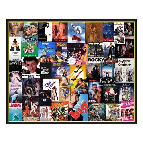 Movie posters include: National Lampoon's Vacation; Grease; Scarface; Die Hard; Airplane; Raiders of the Lost Ark; Nightmare on Elm Street, The Breakfast Club; The Terminator; Clockwork Orange; Caddyshack; Planes, Trains and Automobile; We Found Roger Rabbit; Dirty Harry; Rocky; Welcome to America; Full Metal Jacket; The Karate Kid; The Blues Brothers; Ferris Bueller's Day Off; The Godfather; Back to the Future; Top Gun; The Goonies; The Princess Bride; Kramer vs. Kramer; Weird Science; Star Wars; Dirty Dancing; Deliverance; Blade Runner; Ghosthunters; Beetlejuice; Footloose; Jaws; Saturday Night Fever; E.T.; Sixteen Candles; Cannonball Run; Big; Romancing the Stone; Smokey and the Bandit; Pretty in Pink.