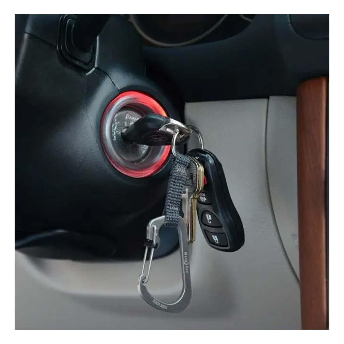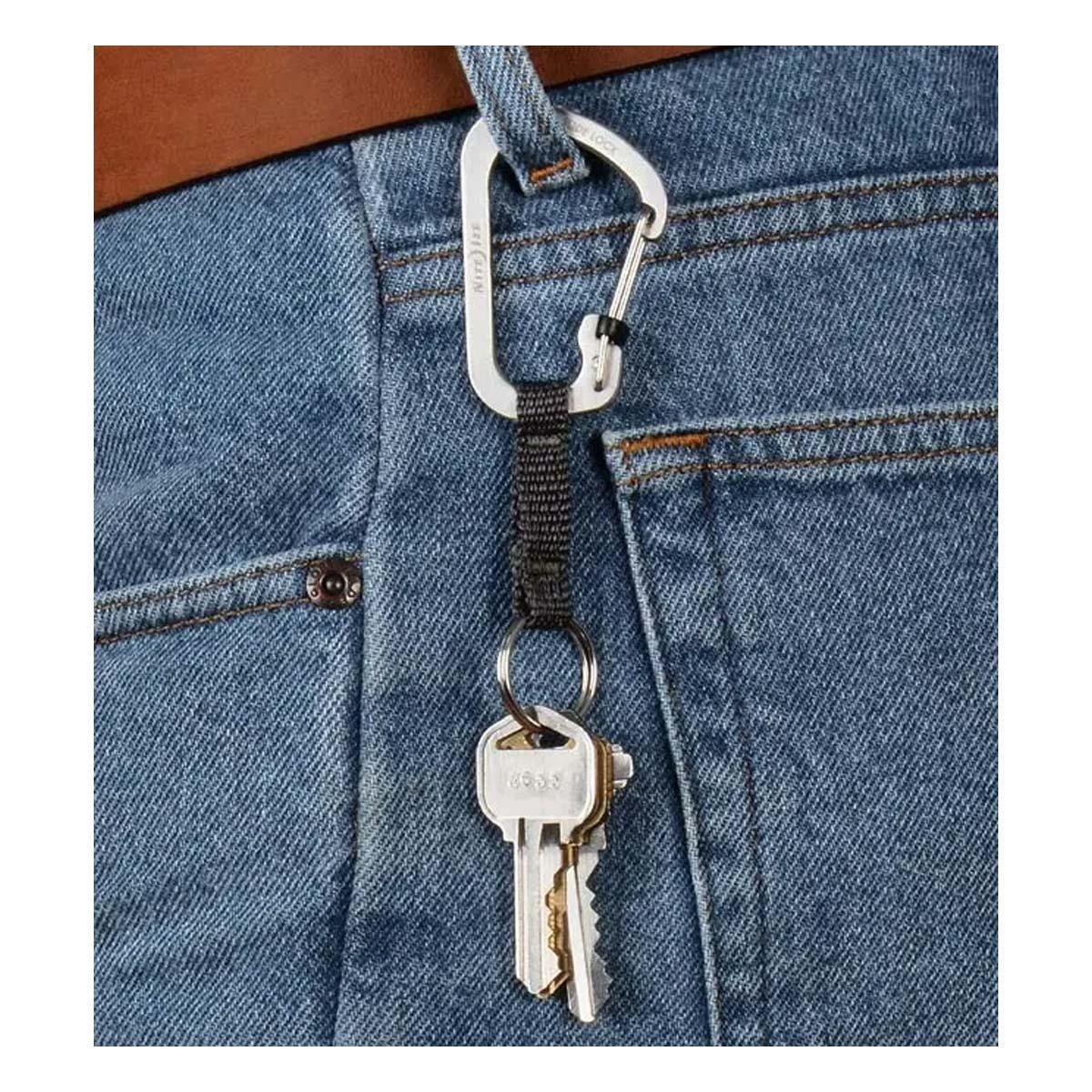 What do you get when you combine a locking carabiner, a key ring, and a nylon strap? A great way to hold your keys.This #3 locking carabiner and key ring combination are joined with a short nylon webbing strap, keeping keys separate, yet connected.This key holding solution pairs our secure stainless steel #3 SlideLock Carabiner with a durable key ring and joins them with a strong nylon webbing strap. This combination creates a great way to keep keys connected, yet separate. The Carabiner can be clipped and locked to anything like a belt loop, backpack or water bottle, while the key ring hangs freely from the webbing strap.