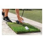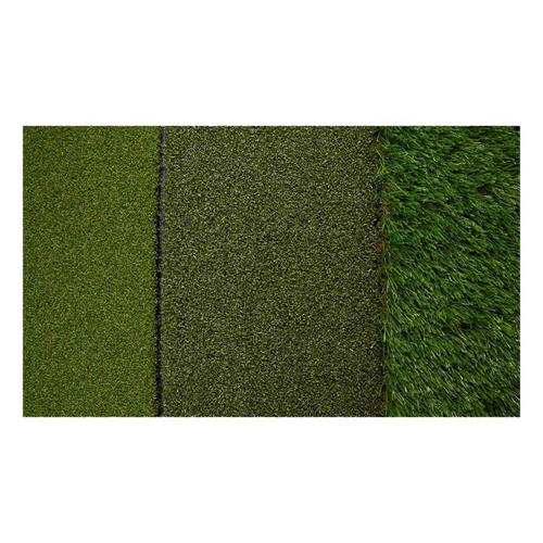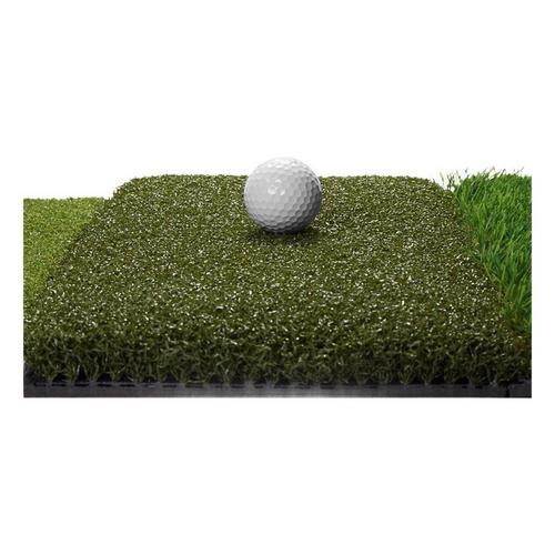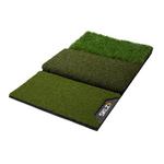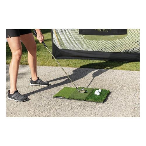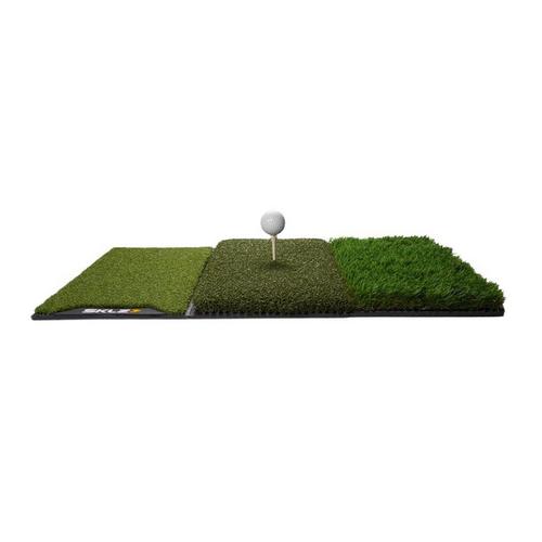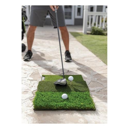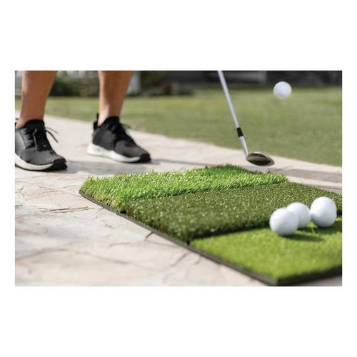 Work on your shots from three different lies and improve your game using the Pure Practice Mat. Practice at home on the tee turf, fairway, and 1st cut rough to help simulate real shots that happen on the course. Build ball contact and consistency to help increase distance and lower your handicap. Features include a Tee Turf design that holds all kinds of tees firmly, fairway cut to simulate long and short iron shots from the middle of the fairway with a tight lie, and a 1st cut rough to help practice ball striking in deeper lies and improve recovery shots. The durable mat is built to hold up through vigorous use and measures at 25” x 16” for easy storing.