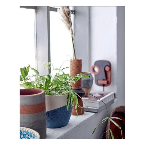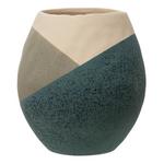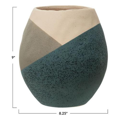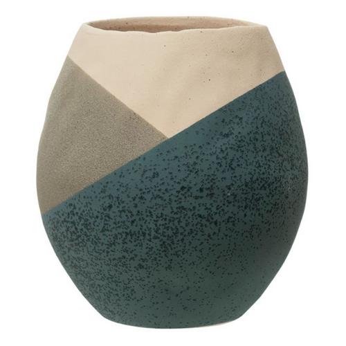 This splendid hand-painted stoneware planter has a gorgeous multi-colored and multi-textured finish. It adds a modish contemporary touch and will look great on a table, mantle, dresser, or bookshelf. This stoneware planter is a contrast of cream, greyish beige, and blueish green, with three different variations of sand-textured finish. Additionally attractive as a decorative accent piece or filled with faux or dried stems. Planter holds a 5" pot.