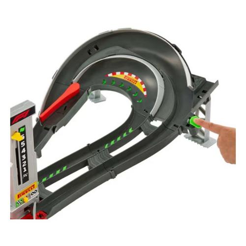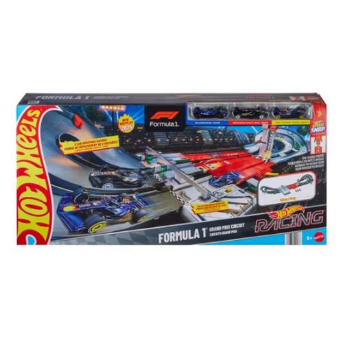 Recreate the thrilling racing excitement of the Formula 1® Grand Prix Circuit with this track set from Hot Wheels. In race mode, the lap counter tracks the cars as they whip through the three-lane booster and speed around dynamic turns and elevation changes, just like on real city streets. Kids can engage the interactive DRS diverter that allows vehicles to overtake the leader in a turn – the winner will be first to the finish gate. In infinite mode, race the three included F1® die-cast cars continuously, manually adjusting diverters to boost the competition. Tracks feature Speed Snap Track connection points to extend the race with more tracks and sets. (Additional Hot Wheels tracks and sets are sold separately.) Colors and decorations may vary.