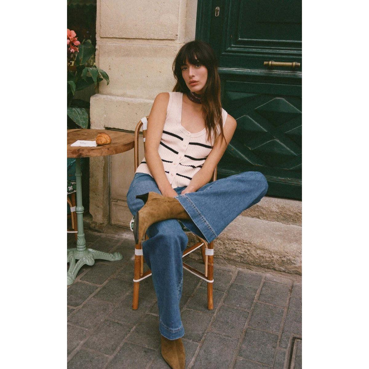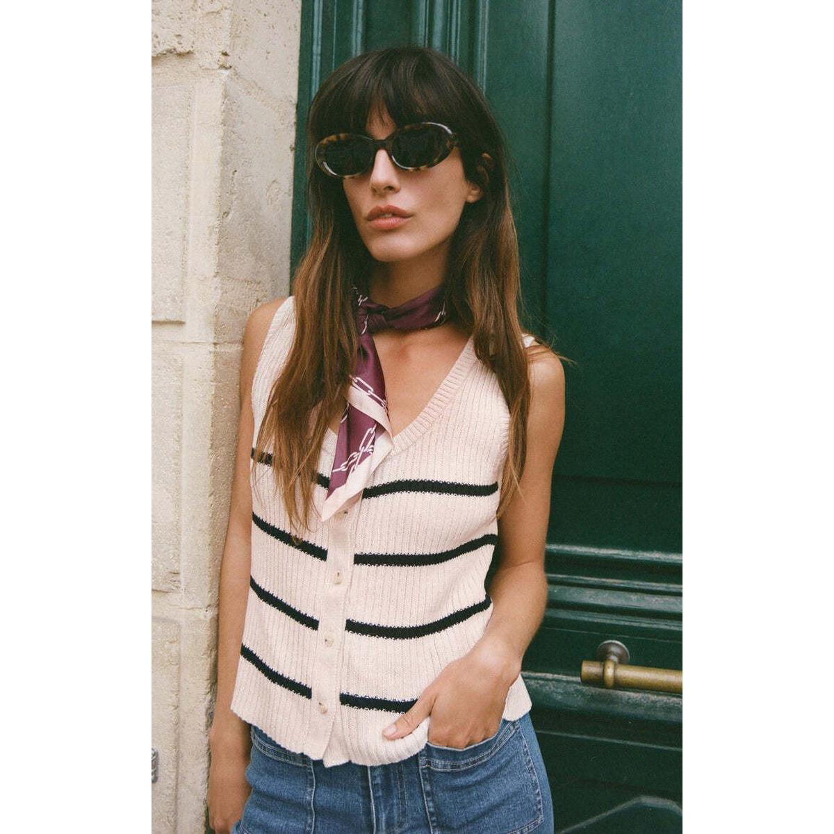 A modern-meets-vintage vibe, this striped button-up vest is made from textured crochet and features a scoop neck for an easy, wearable fit. Style it solo or layered for a look that’s effortlessly chic.