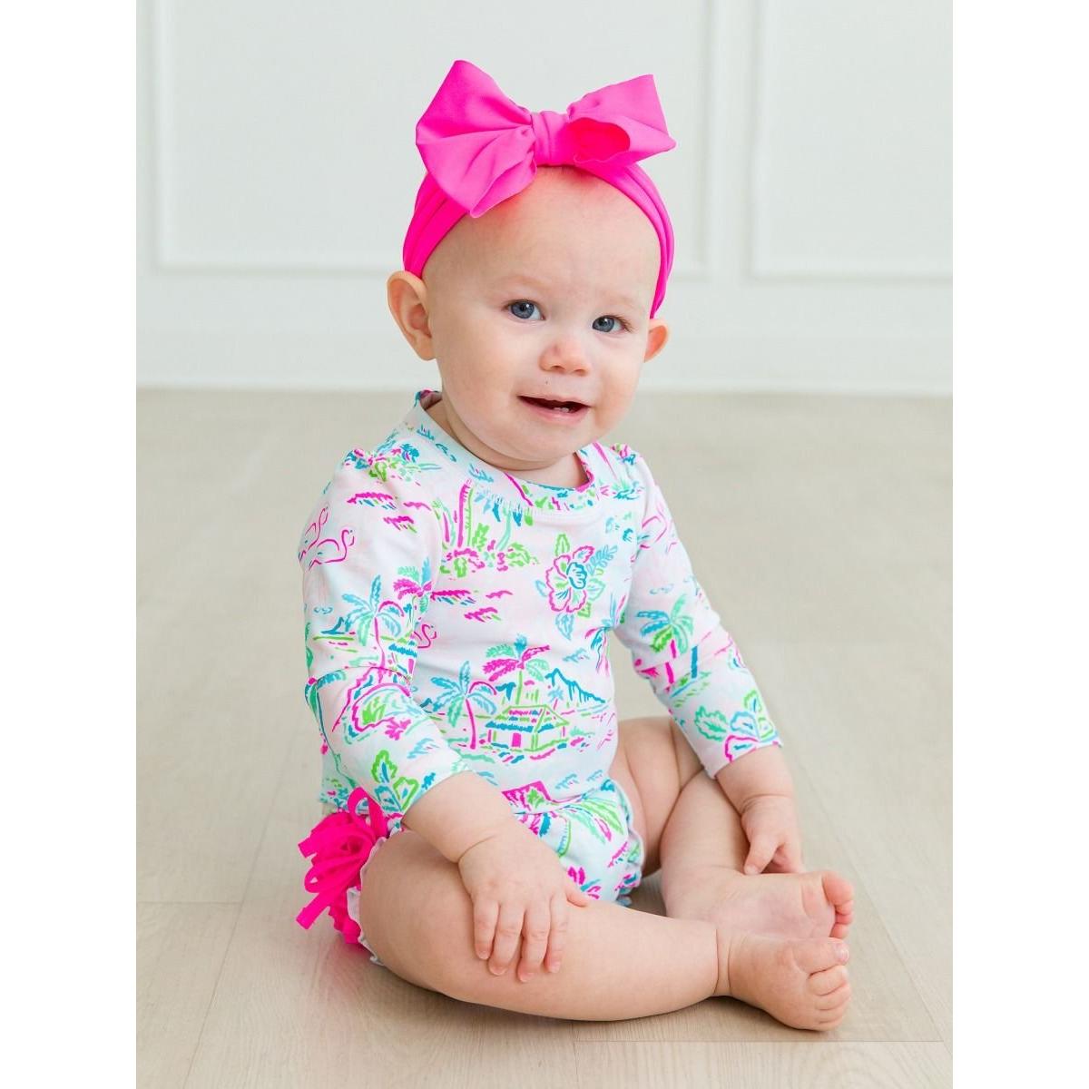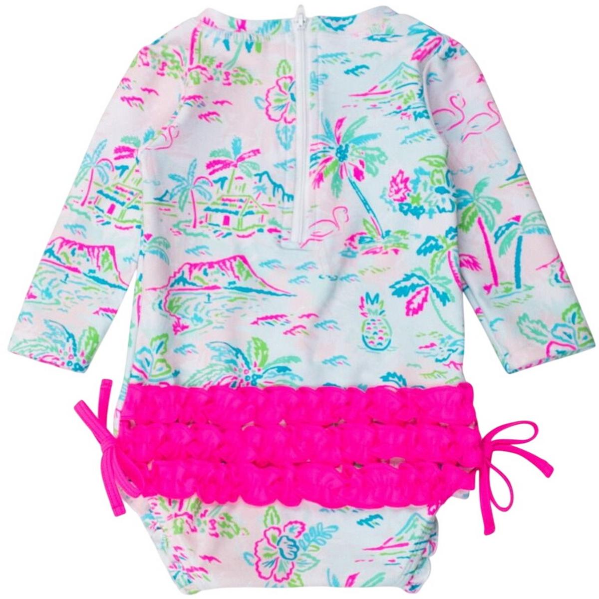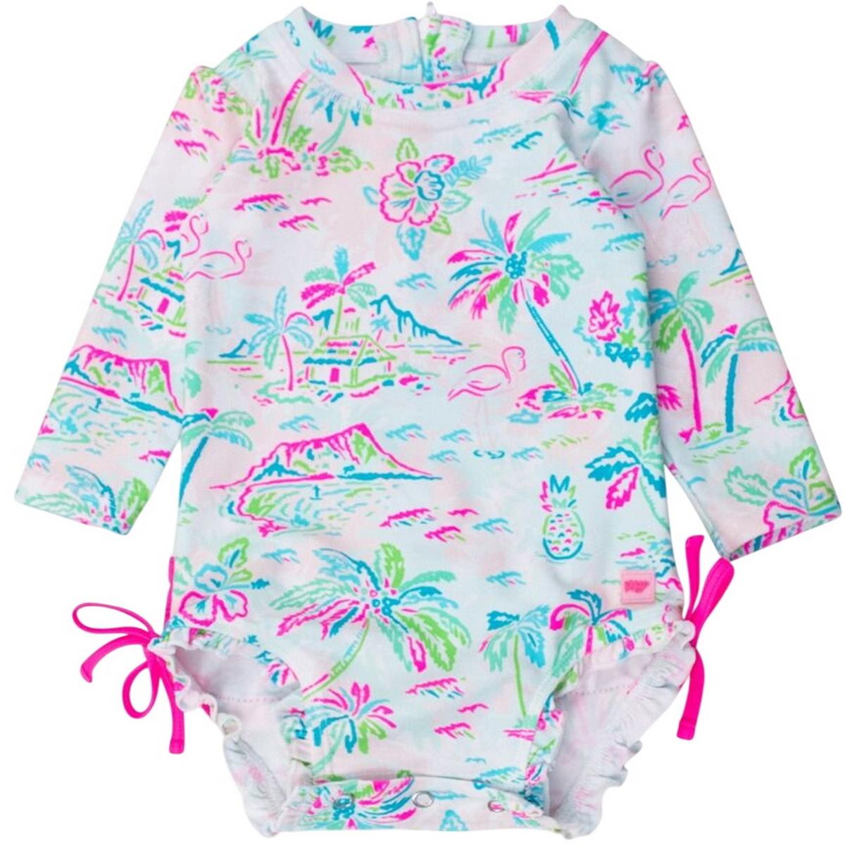 {"reviews":[],"offset":0,"limit":10,"total":0,"gtin":"849490019907"}"Full Description:\nA wonderful addition to your little girl's swimwear, this One Piece Rash Guard is comfort and style rolled into one. Snaps at bottom make for easy changing. Made with sun protected fabric for all day protection and comfort.\n\nFeatures:\n\u003cul>\n\u003cli>UPF 50+ fabric\u003c/li>\n\u003cli>Signature rear ruffles\u003c/li>\n\u003cli>Snaps for quick diaper changes\u003c/li>\n\u003cli>Long sleeves for extra coverage\u003c/li>\n\u003c/ul>\n\nSpecifications:\n\u003cul>\n\u003cli>80% Nylon / 20% Spandex\u003c/li>\n\u003c/ul>\n"