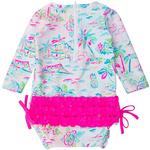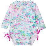 A wonderful addition to your little girl's swimwear, this One Piece Rash Guard is comfort and style rolled into one. Snaps at bottom make for easy changing. Made with sun protected fabric for all day protection and comfort.