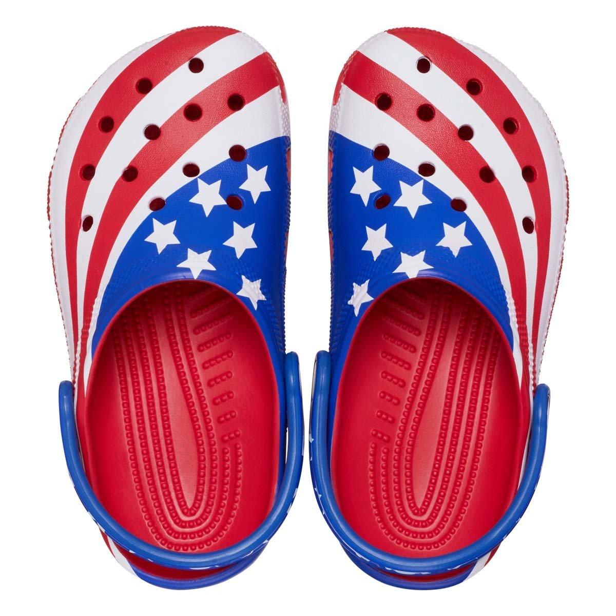 The iconic clog that started a comfort revolution around the world, now with an Great American Flag print! It's the irreverent, go-to comfort shoe that you're sure to fall deeper in love with day after day. Crocs Classic Clogs feature lightweight, cushioned construction and offer an ongoing invitation to be comfortable in your own shoes. Sparkle on!