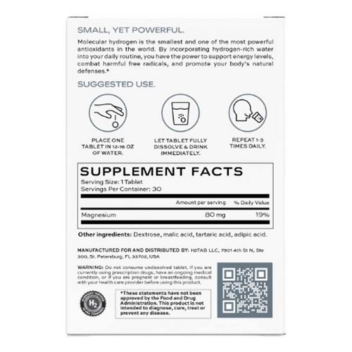 Each pack of H2Tab comes with 30 dissolvable elemental magnesium tablets. When these tablets come in contact with water, they produce millions of nanobubbles filled with pure molecular hydrogen.