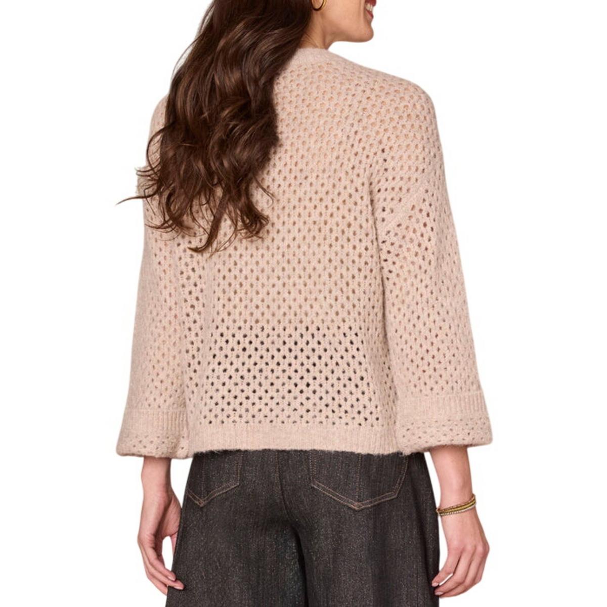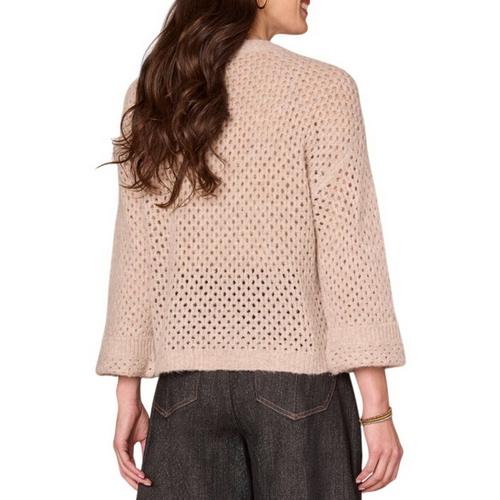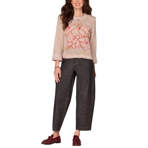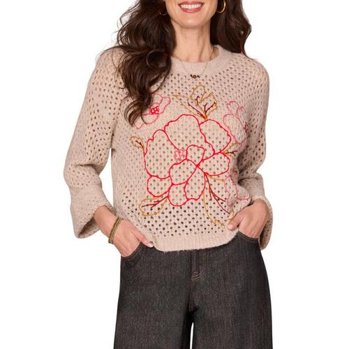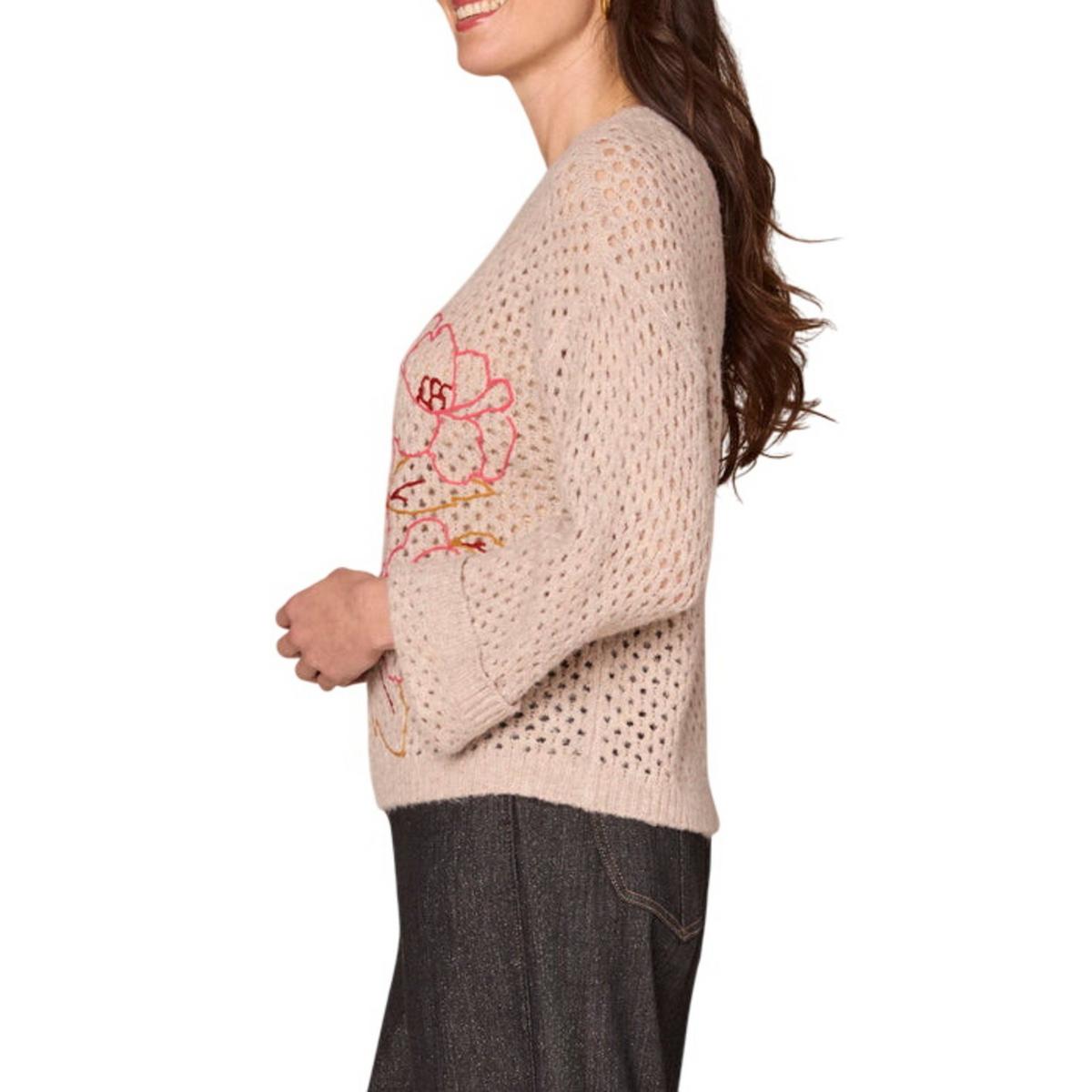 Lounge in style with this soft sweater, designed with long cuffed sleeves, a round neck, and multi color floral embroidery. Its open work design makes this style a good option for wearing over a tank top or other layer.