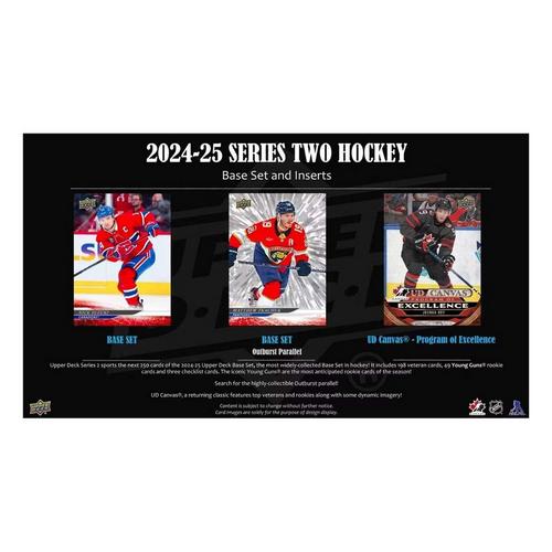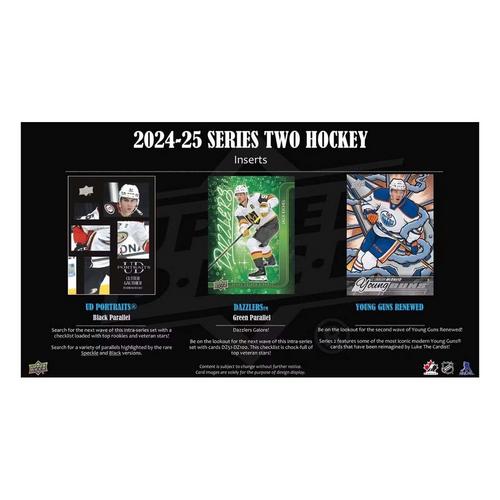 Upper Deck presents the 2024-25 NHL Series Two Hockey Trading Card Blaster Box. Each box contains 4 packs with 12 cards per pack. Look for Stunning Green Dazzlers Card in every box! Look for Art-Infused Young Guns Renewed card per box! Content may vary.