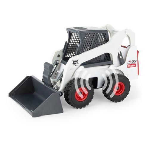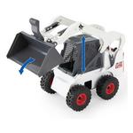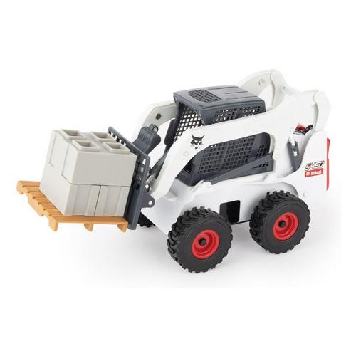 The 1:16 Bobcat S450 Skid Loader Construction Set features lights and sound on the skid loader. This set will include 4-construction cones, 4-construction barrels, 4-cement blocks and one wooden pallet. The bucket and forks are interchangeable on the skid loader. This set will provide hours of fun for the small construction engineer!
