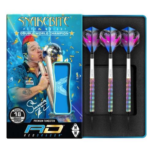 Red Dragon Peter Wright Snakebite 1 darts took several months of design to get right for Mr. Wright as he really wanted something that gave him perfect grip and performance, but also looked strikingly different to any darts on the market, like Peter himself. Peter "Snakebite" Wright is the most colorful player in world darts and he has managed to match his flair and flamboyance into his own set of darts. Known for having a mo-hawk hairstyle which changes color every tournament, these Snakebite darts also change color every time in different lights. Snakebite's are coated using a rainbow effect so no 2 sets will ever be exactly the same and every set is totally unique. Color may vary from dart to dart on coated darts.