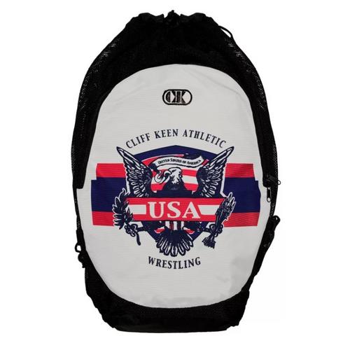 Get In The Circle with Cliff Keen's newest Wrestling Backpack! Show off your wrestling gear in style with a bag that works for you: includes two water bottle holders, a roomy inner dry pocket, an outer MESH pocket for your wet or soiled gear, and a handy loop to attach your wrestling headgear to! Features Cliff Keen's signature logo on both sides, and our newly designed Historic Eagle logo in a patriotic sublimated print on the front gray pocket.