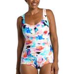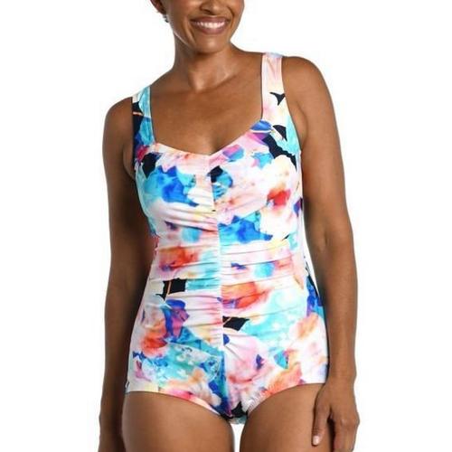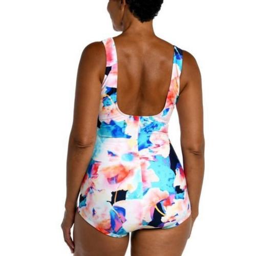 It's just another day in paradise with this one-piece suit, all abloom with tropical flowers in bright, vibrant hues. The sweetheart neckline accentuates the bust, while center shirring draws the waistline in for figure-enhancing style. Best of all, the girl-leg cut fully covers your tush and hips, so you look and feel fabulous.