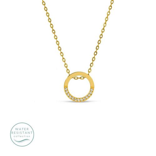 Crafted with a stainless steel base, this necklace is then expertly finished with a radiant 18K gold plating, providing the rich luster of solid gold at an accessible price. What truly sets this necklace apart is its water resistant quality, giving you peace of mind from splashes and daily exposure. This makes it ideal for those seeking jewelry that can keep up with their active lifestyle without fear of tarnishing.