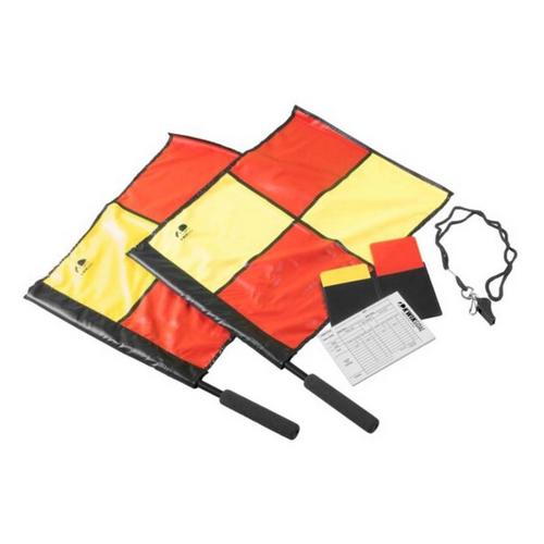 The 15B2801 Premier Referee Kit includes all items necessary to get you started you're your referee career. The 15B2801 includes 2 premier soccer linesman flags with fluorescent red and hi-vis yellow panels, foam handles and PVC shafts. Additionally, a whistle, lanyard and a wallet with warning cards and a score pad is included.