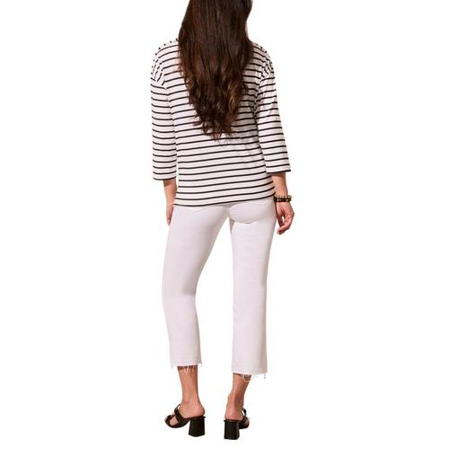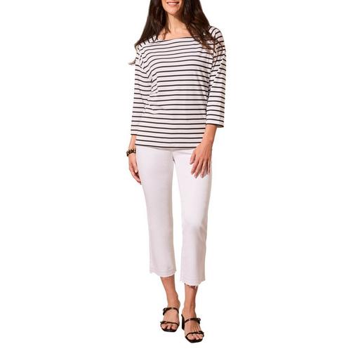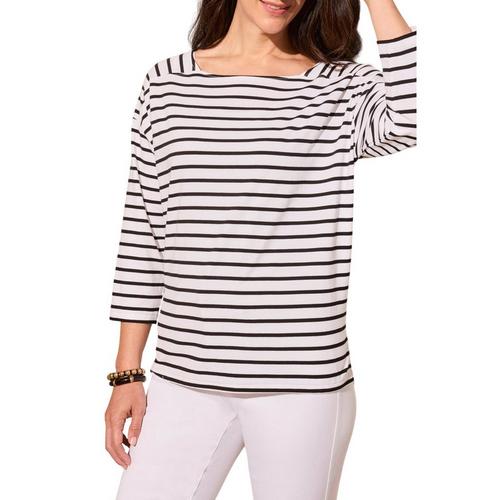 Add a touch of nautical flair to your outfit with this stripe-detailed sweater, designed with a graceful boat neckline. The three-quarter length sleeves offer versatile coverage, making it perfect for transitional seasons. A shoulder yoke enhances the comfortable fit, while side slits provide freedom of movement for all-day ease.
