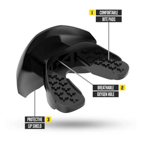 The ONE mouthguard is engineered for increased air flow, comfort and protection. Play after play. Featuring durable bite-pads, an oversized breathing channel, and reinforced lip shield. This mouthguard is built for optimal performance on the field.