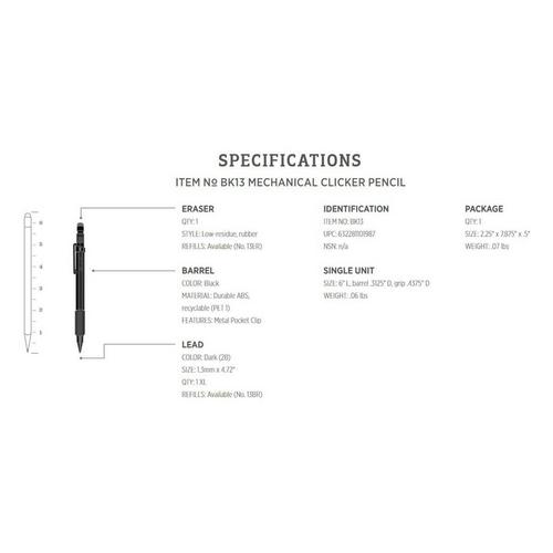 {"reviews":[],"offset":0,"limit":10,"total":0,"gtin":"632281101987"}"Full Description:\nTrue to the Rite in the Rain brand, the mechanical clicker pencils are built to be tough, dependable, and refillable. They’re made to survive.\n\nFeatures:\n\u003cul>\n\u003cli>Easy to Reload: Simply drop a single lead into the shaft under the eraser cap.\u003c/li>\n\u003cli>Dark Thick Lead: The thick 1.3mm lead boldly marks your Rite in the Rain paper just as easily as it marks lumbar.\u003c/li>\n\u003cli>Glove Friendly: The knurled-metal drive and one-hand click lead advancement offer glove-friendly handling/\u003c/li>\n\u003c/ul>\n\nSpecifications:\n\u003cul>\n\u003cli>Color: Black\u003c/li>\n\u003cli>Weight: .07lbs\u003c/li>\n\u003cli>Size: 2.25” x 7.475” x 5”\u003c/li>\n\u003cli>Metal pocket clip\u003c/li>\n\u003c/ul>\n"