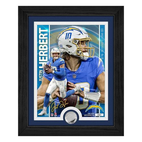 The Los Angeles Chargers' Justin Herbert is featured in this limited edition 13"x16" framed collectible that includes a stunning 8"x11" custom-designed artist print and a minted 39mm Los Angeles Chargers silver-plated coin. Elegantly double-matted and protected under acrylic glass, this premium display piece is a must-have for NFL fans and collectors. Only 1,000 individually numbered pieces exist — each officially licensed by the NFL and NFLPA. Each frame includes a certificate of authenticity. Proudly made in the U.S.A. by The Highland Mint, this collectible arrives ready to hang and ready to impress.