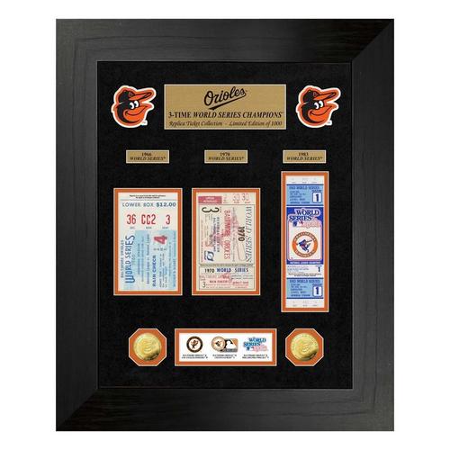 A limited edition of only 1000! Featured in a black 24" x 28" wood frame with 2.5" wide molding and double matting is the Baltimore Orioles commemorative World Series ticket collection! This collectible frame is highlighted with a gold plate 39mm Orioles World Series Champions commemorative coin and a gold plate 39mm team coin. Also matted in the frame are engraved nameplates and die cut team logos. Each frame has an individually numbered certificate of authenticity adhered to the back. Officially licensed by the MLB and proudly made in the U.S.A by The Highland Mint!