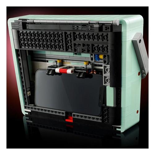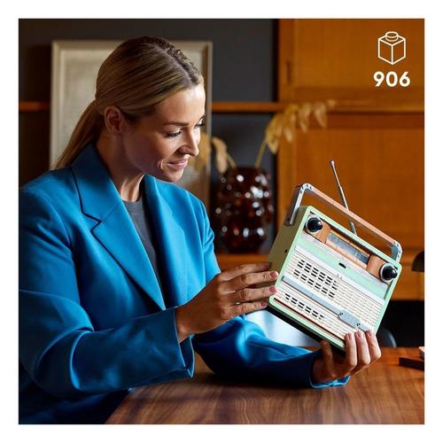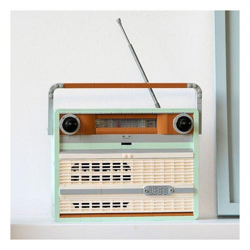 Enjoy an immersive building project with this LEGO® Icons Retro Radio (10334) set. Craft an ornamental replica of a 1970s vintage radio with a foldup handle and antenna, classic power and tuning dials and a sliding frequency switch. Rotate the dials to emit tuning signals and music snippets. Mount a smartphone in the rear compartment to relish your favorite tunes while bringing a cool retro vibe to your home or office.