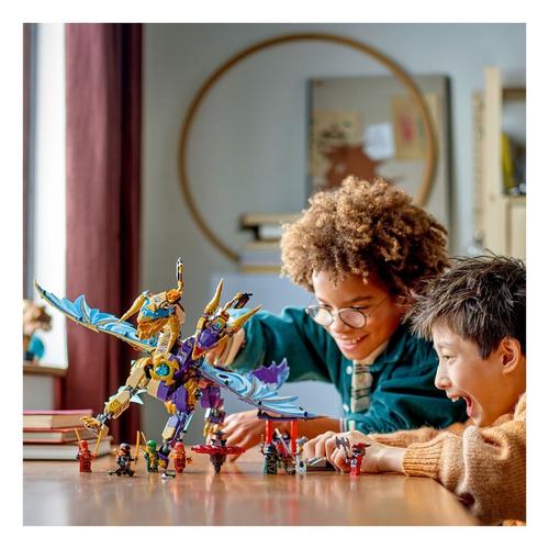Delight boys and girls aged 9 and up with this LEGO® NINJAGO® Arc Dragon of Focus (71836) ninja toy that lets them role-play epic action scenes from season 3 of the NINJAGO Dragons Rising TV show. This building kit features a 2-headed dragon figure with posable tail, legs, feet, head, neck, jaw and claws. Kids can activate a shooter in its chest and move its large foil wings back and forth using a lever on its back. This battle playset includes 8 NINJAGO character minifigures for ninja fans to stage action-packed adventures. Find ninja warriors Lloyd, Cole, Wyldfyre and Kai, and their ally Pixal, each with a ninja weapon accessory, plus villains Drix, Zarkt and a Dragonian Warrior with their own weapons. For more play value, the LEGO set comes with a cool spinjitzu spinner vehicle. Kids can place a minifigure inside and press a button on its launcher that fires it into a rapid spin, then watch as 2 power elements possibly fly off as it hits its target.