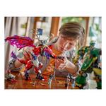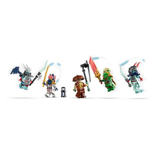 This adventure toy battle set features 5 minifigures: Sora and Lloyd armed with ninja weapon accessories to take on the villainous trio of Kur, Tyr and a Spectral Dragonian Warrior, who have a banner containing a secret message that can only be read using by Lloyd’s translucent reveal blade. Sora has a flying motorbike toy to ride, while the villains have a posable specter dragon toy, which can be combined with parts from the Thunderfang Dragon of Chaos (71832) playset (sold separately). Set contains 1,112 pieces.