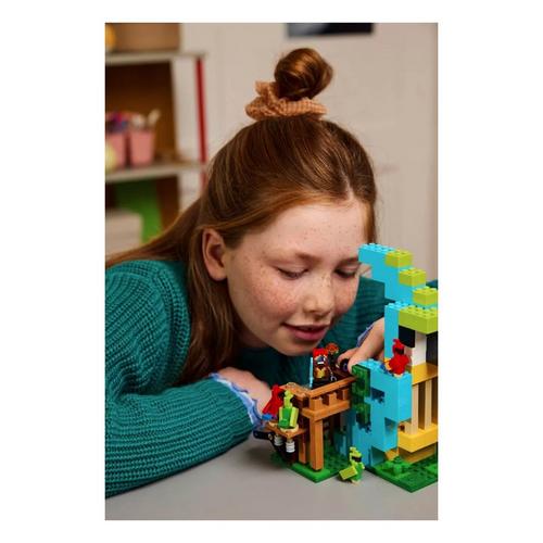 This jungle building set includes Jungle Ranger and Parrot Handler minifigures, plus 2 red parrots, 2 green parrots and a skeleton. The buildable red parrot house features folding wings and has a storage chest and barrel inside. The parrot can be detached from the house for separate play. The buildable blue parrot house contains a jukebox with a music disc element and a function that makes the 2 parrots dance. A diamond sword, axe, chest, map, wheat seeds, coal, diamonds, cocoa beans, shears, torches and other gaming accessories inspire kids’ imaginative play. For digital fun, the LEGO Builder app lets kids zoom in, rotate models in 3D and track their progress.