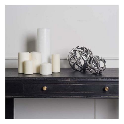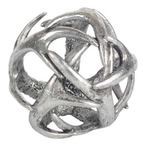 A striking silver decorative orb shaped like intertwining antlers, the Mercana Ramus III adds a modern rustic touch to shelves, tables, or centerpieces with its unique sculptural design.