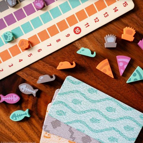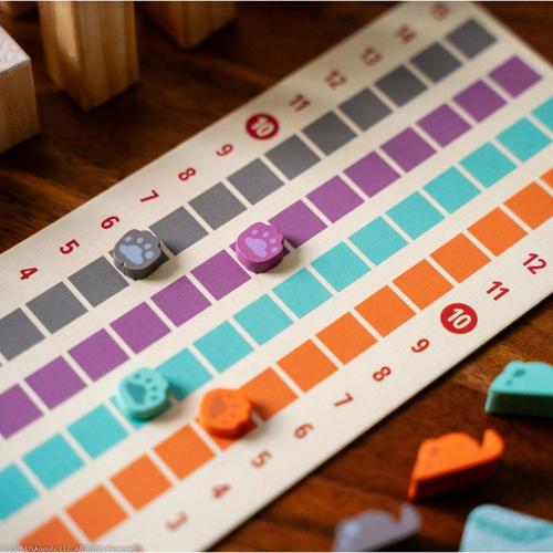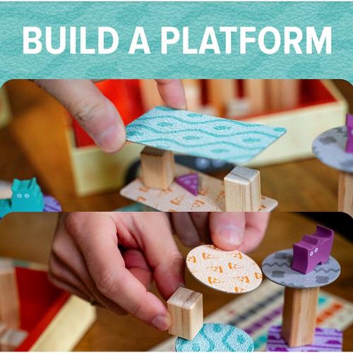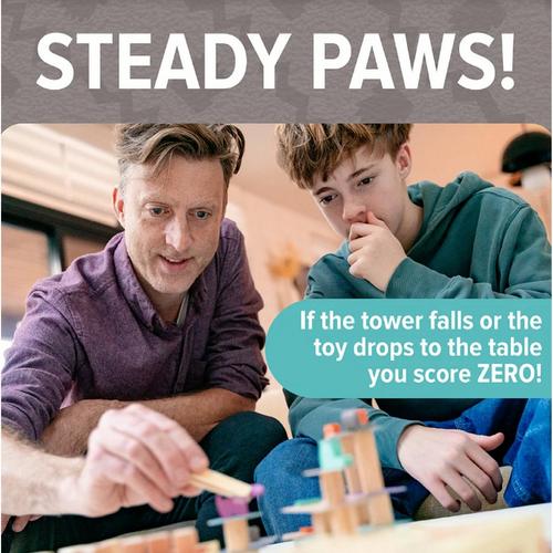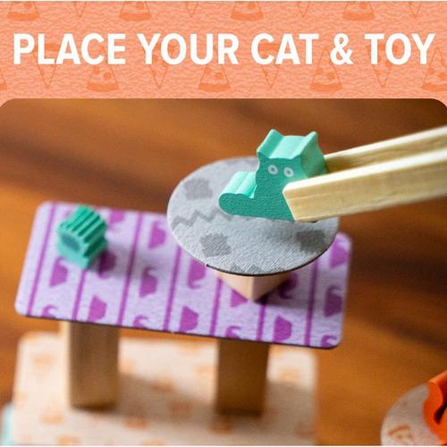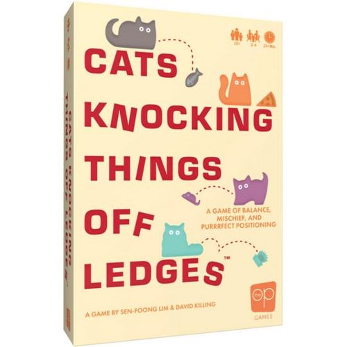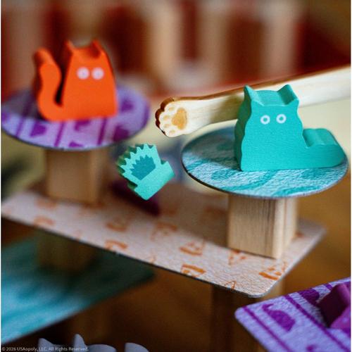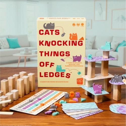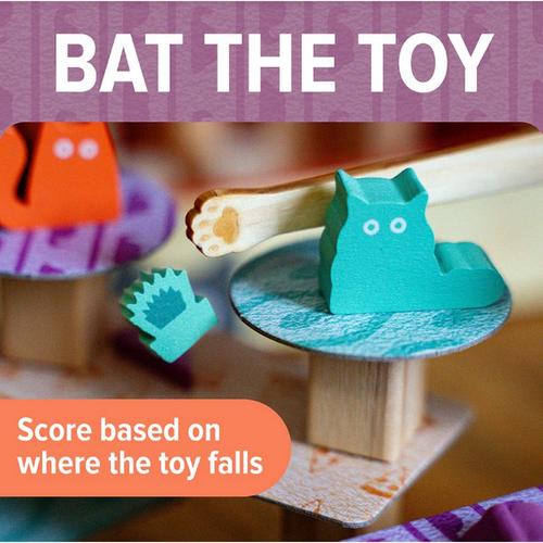 In Cats Knocking Things Off Ledges™, players take turns building a wobbly tower of platforms, placing their cats, and batting toys off the edge to score points based on how far they fall. But watch out - if the tower tumbles, you score zero! Earn extra points by landing on specific platforms, and race to be the first to reach the highest score.