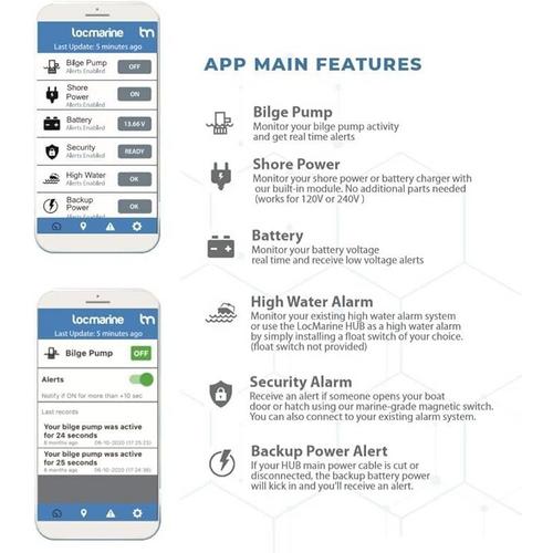 Imagine a new way to stay connected to your boat. The good news is, you can easily monitor your boat remotely, at any time, from any location, with LocMarine Boat Security and Monitoring. The LocMarine LTE-10 Boat Monitoring and Security HUB device requires the 'LocMarine Pro' phone application available to download from the App store (Apple) or Play store (Android).