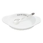 Coleslaw Bowl Set. This elegant 2-piece set includes a beautifully crafted ceramic bowl featuring convenient side handles for easy carrying and serving. The bowl is designed with a smooth, glossy finish that adds a touch of sophistication to any dining table. Accompanying the bowl is a stamped silverplate spork, combining the functionality of a spoon and fork for versatile use. The dish measures 2 inches in height and 10 inches in diameter, providing ample space for serving your favorite salads, coleslaw, or side dishes. The spork is 8 1/2 inches long, perfectly sized for comfortable handling. Made from high-quality dolomite, this set is both durable and stylish, making it an ideal addition to your kitchenware collection.