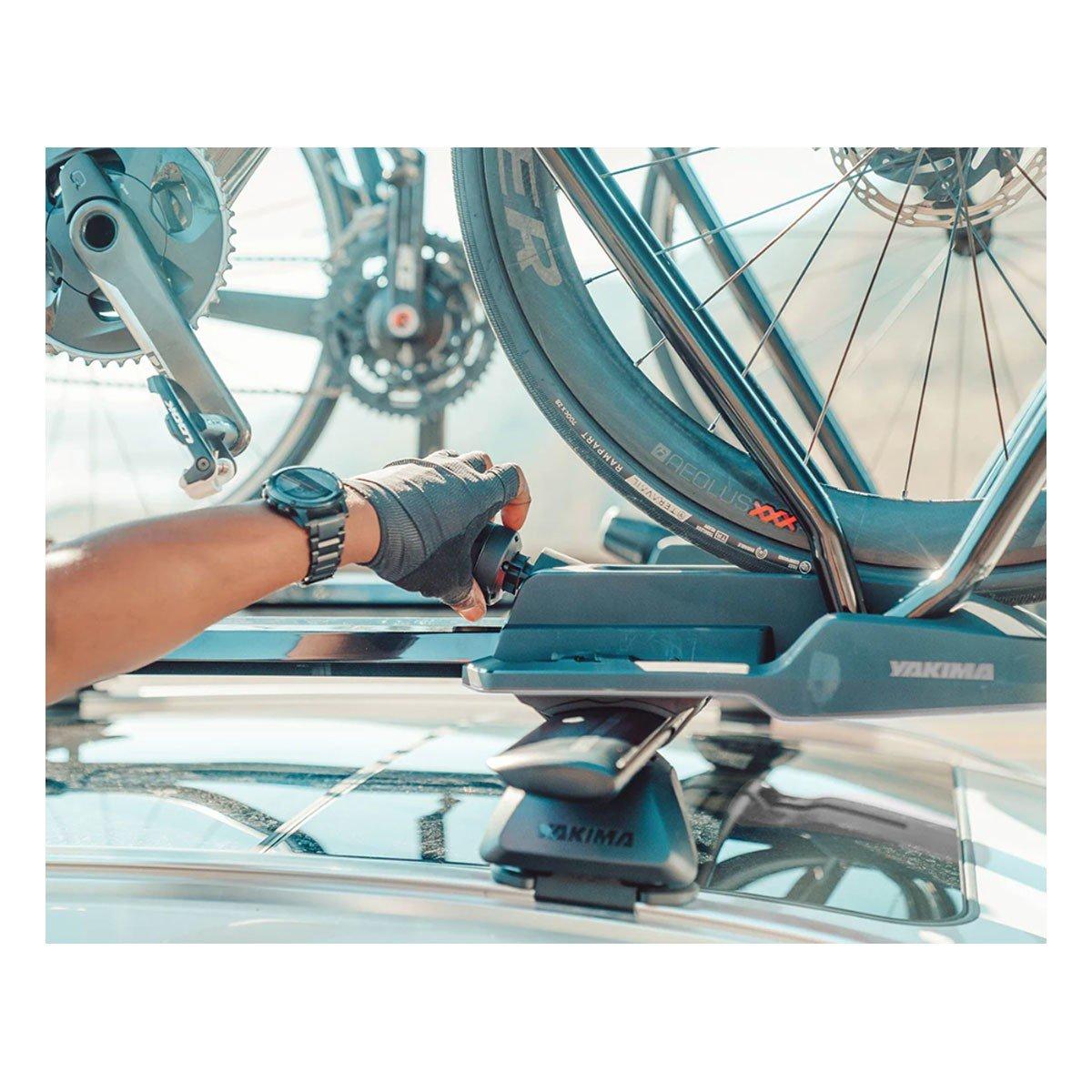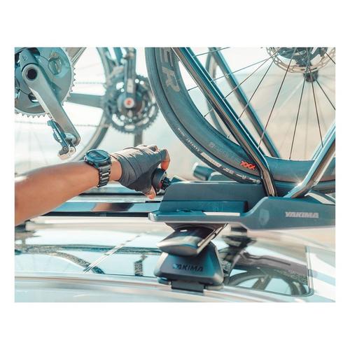 Secure, sleek, and simple to use, the HighRoad is Yakima's premium upright bike mount. The adjustment-free hoop, with its TorqueRight™ tightening knob, loads a variety of bikes quickly and easily. The HighRoad secures the bike by the wheels for ultimate bike protection and the low-profile design minimizes hatch interference. Universal mounting hardware fits most roof racks.