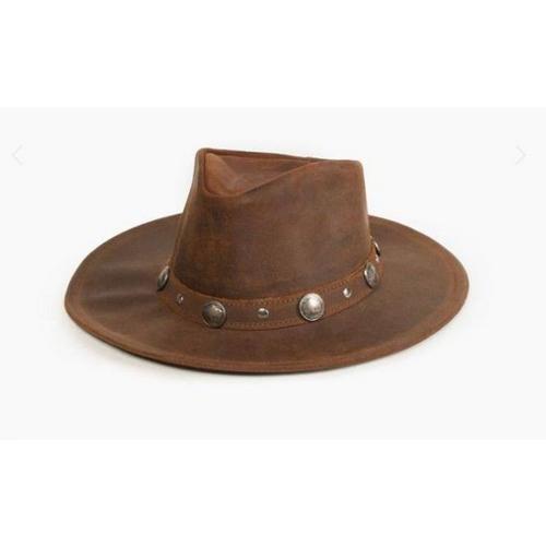 This durable classic is handmade from genuine ruff leather that keeps the sun and other elements out. A band wraps around with studs and unique Buffalo nickel metal accents with a small tie in back. Personalize this wide brimmed hat by shaping it to suit your style. The brim has hidden steel wire, so you can wear this western hat any way you want.