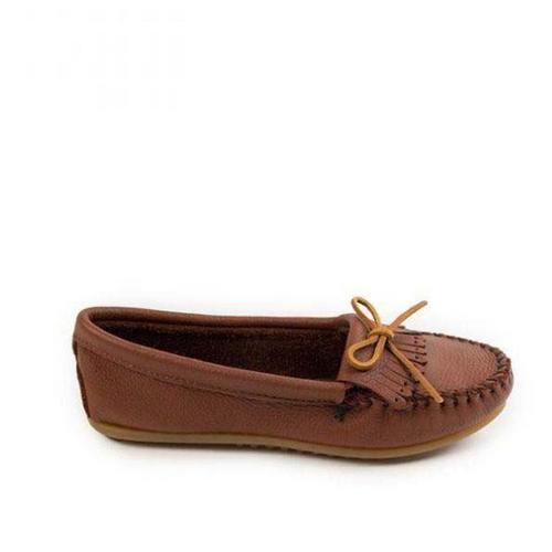 Minnetonka's popular Kilty moc gets a luxe, deerskin makeover. Durable high-quality deerskin gives this moccasin its super-soft feel. Its sporty, flexible rubber sole moves comfortably with you. Hand stitching, fringe and rawhide laces complete the design.