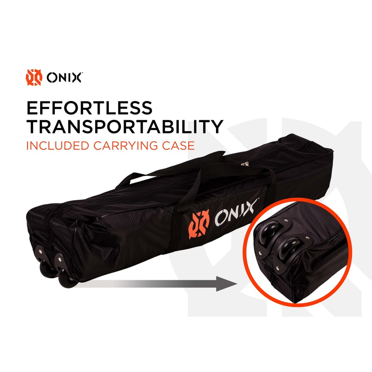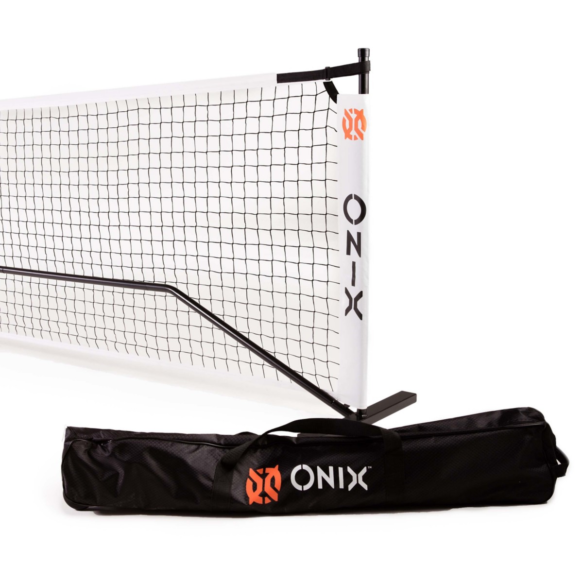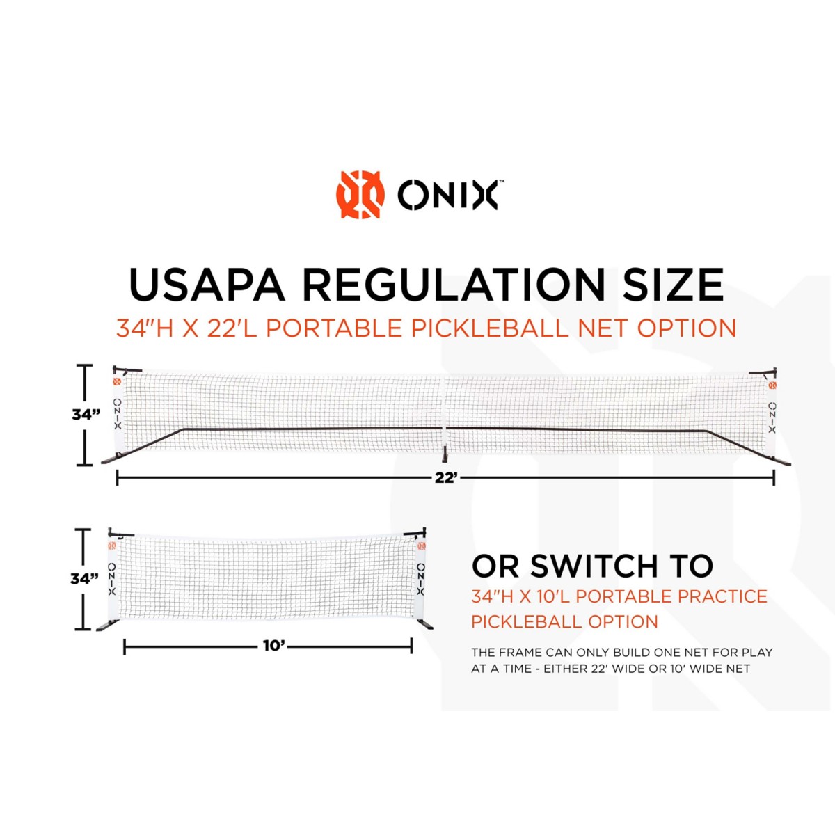 Play pickleball anytime, anywhere with the 2-in-1 ONIX Portable Pickleball Net. This high-quality net is incredibly portable, while offering exceptional playability on the court. Use the net in multi-purpose gym spaces, at the local park, or even in your driveway; this portable net let's you take the game anywhere you can setup a court, but packs into a convenient, compact bag when you are done.  The net is USA Pickleball (USAPA)  regulation size (36"H x 22'W), making it great for tournaments or casual games. You can remove the regulation-size net and place the second 36" H x 11' W portable practice net onto the posts. Constructed of interlocking steel tubes, the ONIX Portable Pickleball Net is not only incredibly durable, but also easily assembled.  The net features an adjustable Velcro strap to achieve perfect tension for exceptional playability. Also, the net features a center post to maintain regulation net height across the entire length of the court.  The outstanding playability of the ONIX Portable Net is rivaled only by the ease of assembly and portability. The net quick and easily breaks down into a compact and lightweight 40" L x 7" W x 5" H bag with straps and wheels, allowing you to roll or carry the bag to its next location.