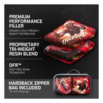 Officially Licensed ACL® PRO Overload™ Bags – officially licensed and certified bags for tournament-level play. Crafted to meet the highest standards set by the American Cornhole League (ACL), these bags ensure superior quality in material, construction, and finish. The dual-fabric design, combining brushed synthetic Poly-SG1 and compressed Poly-GT1 fabrics, offers unmatched shot selection for serious players, enabling slide shots, push shots, roll shots, and flop shots. With a dual speed rating of 94 Fast and 68 Slow, the Overload™ bags provide versatility in play. The proprietary tri-weight resin blend filler, engineered with Dust-Free Resin Technology (DFR), delivers flexible, hole-friendly weight distribution for enhanced scoring and shot execution. Play like the pros with these regulation-sized 6” x 6”, 16oz bags, CNC machine-sewn and double-stitched for consistent, top-tier performance and ACL® PRO certified quality.