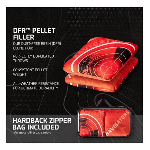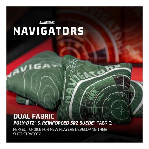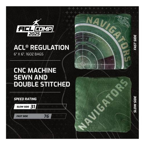Navigate a 4-bagger with the officially licensed ACL® COMP Navigator bags, specifically crafted for competitive play. Tailored for both fans and players seeking a competitive edge, the Navigator features a dual-fabric composition, seamlessly blending Poly-DT2 fabric and SR2-Suede. Ideal for newcomers refining their shot strategy, these bags facilitate the exploration of new techniques, including push shots and block shots, while delivering forgiving performance on faster-playing boards. With a dual-speed rating system of 76 Fast and 31 Slow, the Navigator accommodates various playing styles. The innovative Dust-Free Resin (DFR) pellet filler ensures precise throws, maintaining consistent pellet weight and all-weather resilience for unmatched durability. Meeting regulation standards at 6” x 6” and 16oz., each bag is meticulously CNC machine sewn and double-stitched, ensuring exacting precision and ACL® COMP certified consistency for an enhanced competitive experience.