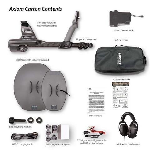 Includes: 13” x 11” Mono Axiom™ Searchcoil, 11” x 7” DD-FC Axiom™ Searchcoil with Focused Core, MS-2 Wired Headphones, Axiom™ Battery Booster Pack, and Soft Carry Case to store your Axiom™ Metal Detector and items.