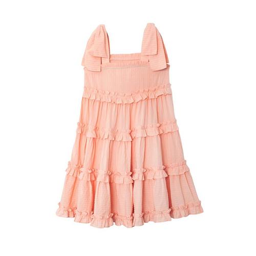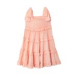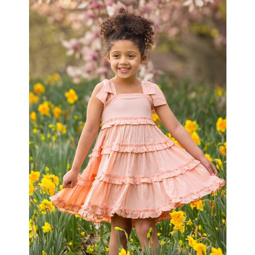 This sleeveless peach dress features a smocked bodice for a comfortable fit and ruffled detailing on the neckline and shoulders. The lightweight design flows into a gently flared skirt, offering ease of movement. A small button closure at the back adds a practical touch. Its soft color and thoughtful details make it a versatile choice for warm-weather outings.