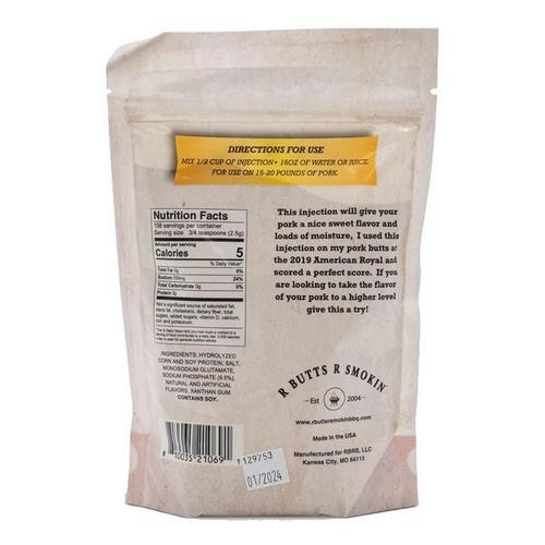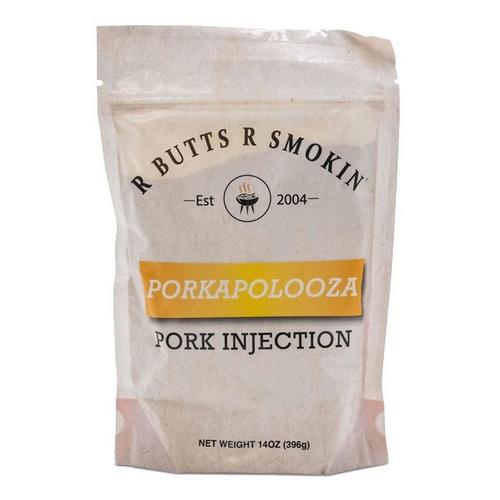Unleash a symphony of incredible flavors with the award-winning Porkapalooza Pork Injection. Crafted with a hint of sweetness, this blend has earned top honors at the prestigious American Royal barbecue competition. Simply mix with water, inject into your pork, and prepare to experience a burst of mouthwatering taste and irresistible moisture. With each juicy bite, elevate your pork dishes to extraordinary heights. Discover the effortless path to peak flavor and succulence with R Butts R Smokin' Porkapalooza Pork Injection.