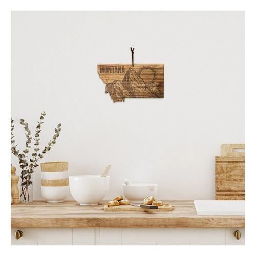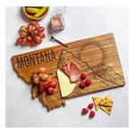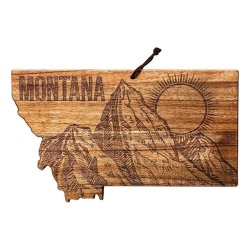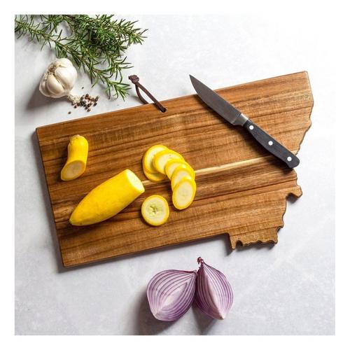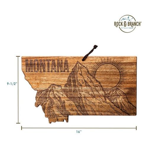 Celebrate The Treasure State with the Rock & Branch Origins Series Montana State Shaped Cutting Board by Totally Bamboo! This beautifully crafted acacia wood cutting board is shaped in the unmistakable outline of Montana. The board also features a bold, laser-engraved design with the state name and art inspired by the state flag featuring a massive mountainscape and a rising sun. It's a fun way to add a bit of local "flavor" to your charcuterie platter when serving favorite meats, cheeses, fruits and breads to friends and family. The reverse side of the board is blank to use as a chopping board when prepping food. The Origins Series Board also includes a hang tie to easily double as wall art when not in use. It's a wonderful way to show off your love of Montana in the kitchen, dining room, den or office. It also makes a great gift for anyone that's a fan of the state.